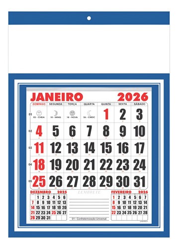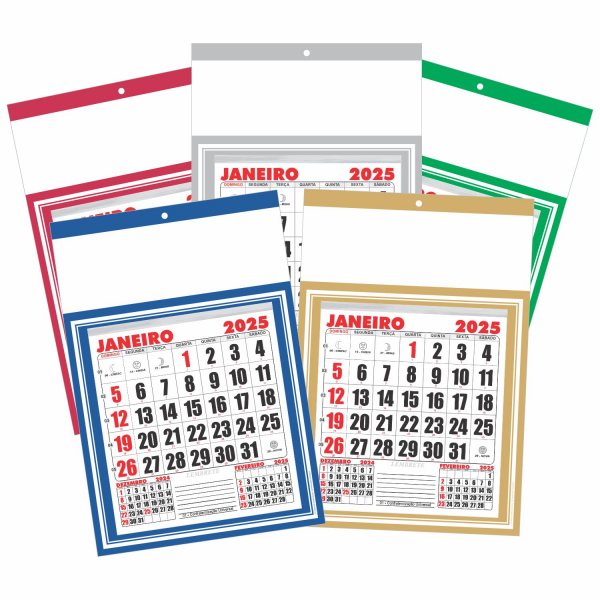 Acabamento: Inclui 1 furo com ilhos de metal e bloco grampeado sobre a base para fácil destaque dos meses.