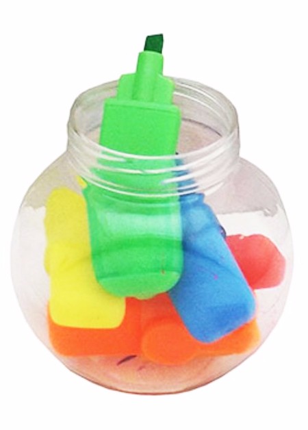 KIT CANETA MARCA TEXTO, COM POTE DE PLÁSTICO TRANSPARENTE, E 5 MINI CANETAS MARCA TEXTO. Tamanho total (CxL): 7.5 cm x 23 cm Medida para gravação (CxL): 5 cm x 5 cm Peso do produto: 54 g