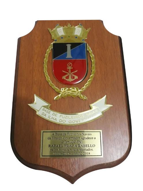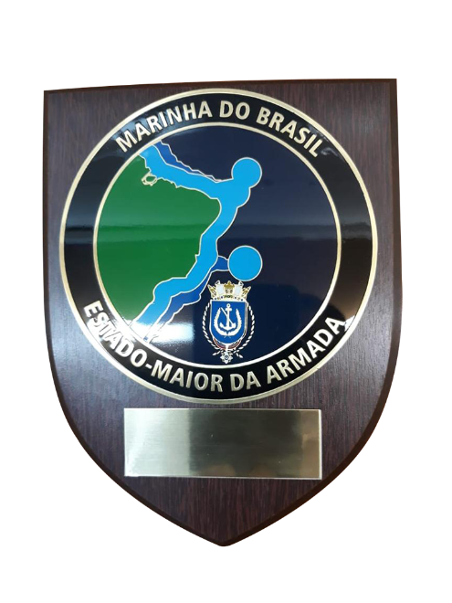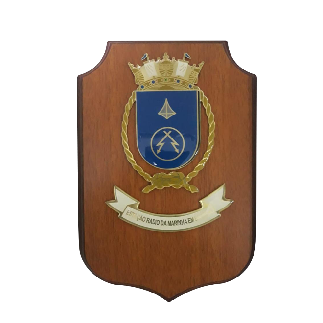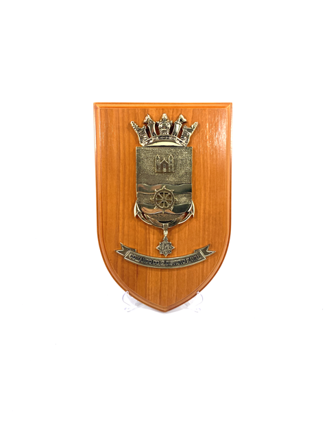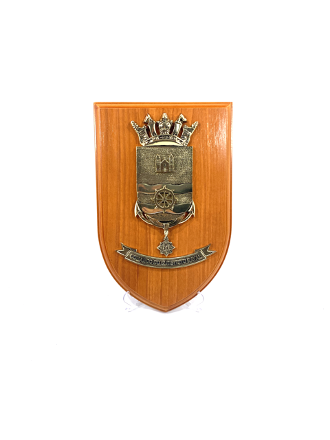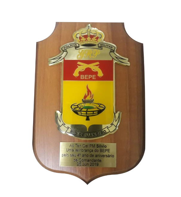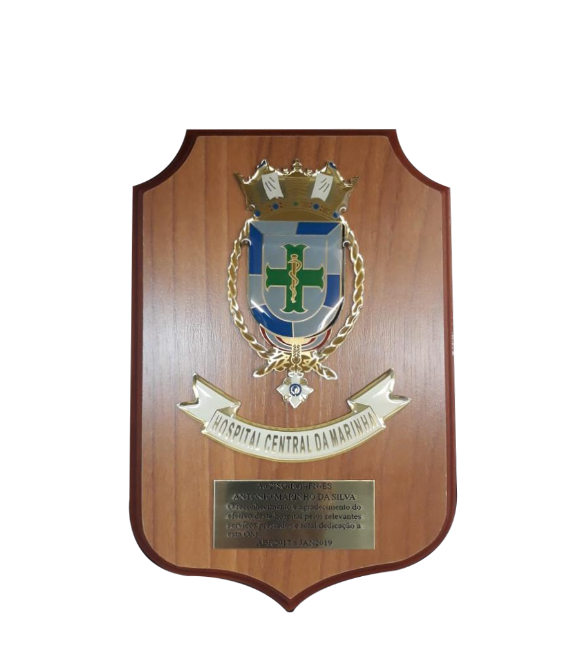 PANÓPLIA. ESCUDO PRODUZIDO EM MADEIRA NOBRE. BRASÃO FUNDIÇÃO EM LIGA DE ZAMAG. EMBALAGEM, ESTOJO DE VELUDO .